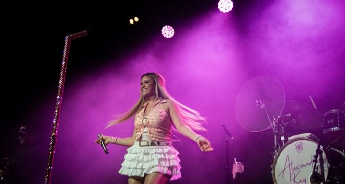 It wasn’t long before Alexandra took the stage – a bedazzled pink microphone stood centre stage, Alexandra’s band walked on and introduced the main gal herself.