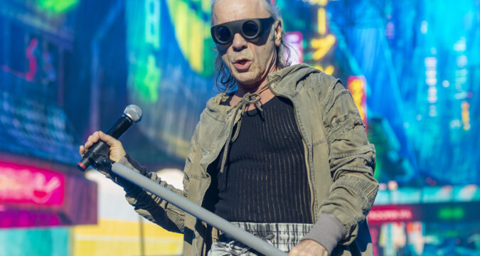 Vocalist Bruce Dickinson appears, running onto the stage, resplendent in an open steampunk style trench coat and dark shades.