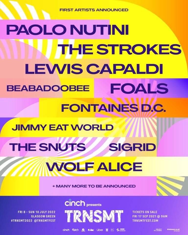 After an unforgettable three days of music in Glasgow Green, cinch presents TRNSMT Festival have announced the line-up for 2022’s event with Paolo Nutini, The Strokes and Lewis Capaldi set to headline, joined by beabadoobee, Foals, Fontaines D.C., Jimmy Eat World, Sigrid, The Snuts and Wolf Alice from 8th – 10th July 2022.