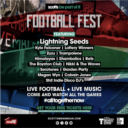 Football Fest is scotts’ latest project as part of their #alltogethernow campaign. It follows the Artists United Collective, a community of rising music talents, who released an emotionally-charged take on The Farm’s indie classic ‘All Together Now’. All proceeds from the track are being donated to the Music Venue Trust to support their #SaveOurVenues campaign