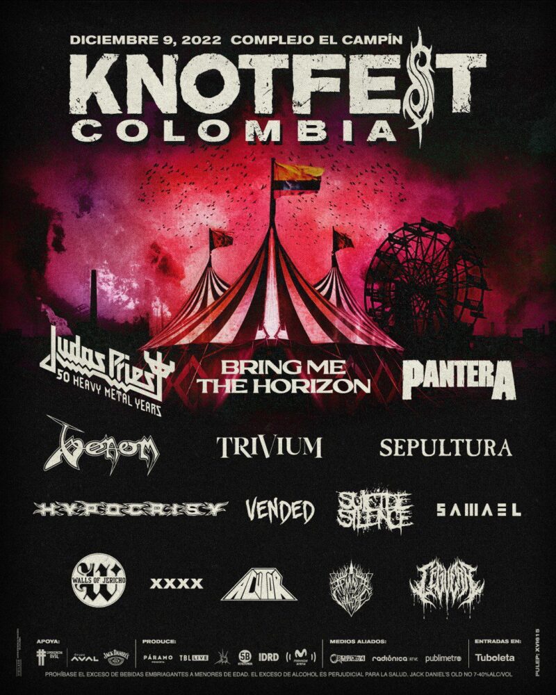 Wednesday, August 24th, 2022 – KNOTFEST, the destination festival brand curated by SLIPKNOT, is continuing its ever-expanding global domination with the announcement of KNOTFEST COLOMBIA 2022 which will take place on Friday, December 9th at Campin Circuit of Bogotá. Headlined by JUDAS PRIEST and the recently reformed PANTERA (featuring Zakk Wylde on guitar and Anthrax’s Charlie Benante on drums), KNOTFEST COLOMBIA’s first wave of bands announced also features BRING ME THE HORIZON, TRIVIUM, HYPOCRISY, SEPULTURA, SUICIDE SILENCE and SOLD with more still to be announced. Tickets go on sale at 9am local time, Wednesday 31st August and can be purchased HERE.