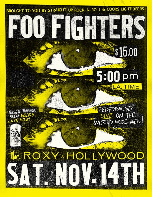 Foo Fighters’ Roxy streaming concert event is brought to you in part by the good people at Coors Light, and will feature innovative new technology custom created for this one of a kind Foo Fighters show: Beer’s Eye View. For 25 years, Coors Light has been on stage – and in hand – with Foo Fighters. Now for the first time, Beer’s Eye View will take fans behind the scenes backstage, into the thick of the action onstage, and to the best seat in the house (the VIB a/k/a Very Important Beer section)—all from the unique perspective of a live “Can Cam” attached to Dave’s own Coors Light.