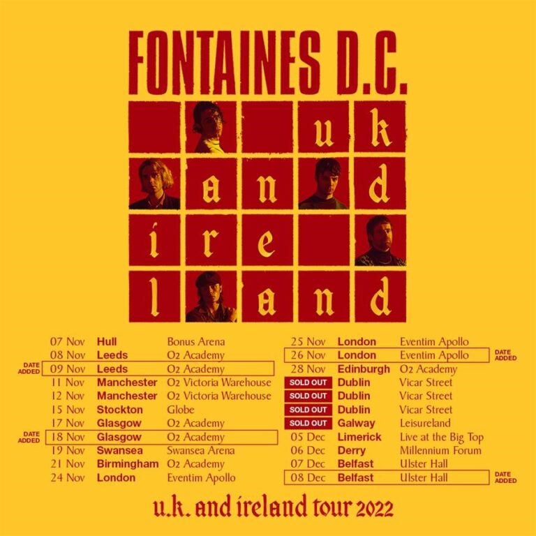 Following an intimate sold-out show at Hackney’s EartH earlier this week, and with many of the band’s forthcoming North American tour dates selling out or having venues upgraded, Fontaines D.C. are also set to play a short run of shows with record stores in May 2022 in support of the new album. These shows come ahead of an extensive run of festival appearances including the band’s return to Glastonbury Festival, a headline slot on the BBC Sounds stage at Latitude Festival, as well a main stage appearance at Reading & Leeds and a Future Sounds stage performance at BBC Radio 1’s Big Weekend. The band will also play an extensive UK / IE headline tour later this year in Nov / Dec 2022, with many further dates being added due to popular demand, including a third date at Eventim Apollo in London.