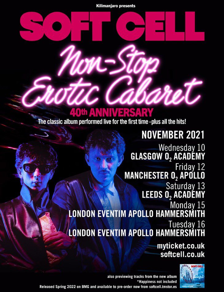 Soft Cell will build towards the album’s release by sharing a new single in the autumn and playing some UK shows in November 2021. The big headline live dates will provide the first chance to hear Soft Cell’s new songs alongside their classic pop hits, all while marking the 40th anniversary of the band’s iconic 1981 debut ‘Non-Stop Erotic Cabaret’. Including two shows at London’s Hammersmith Apollo on the 15th and 16th November, tickets are on sale now from myticket.co.uk/artists/soft-cell.