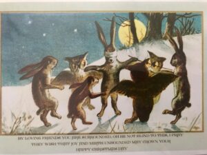Speaking about the video, Chisolm says: “I have an old Victorian postcard of nocturnal animals in the moonlight on a desolate snow-covered hill, holding hands and dancing around a blindfolded rabbit. At the bottom the text reads ‘By Loving Friends You Are Surrounded, Oh Be Not Blind To This’.”