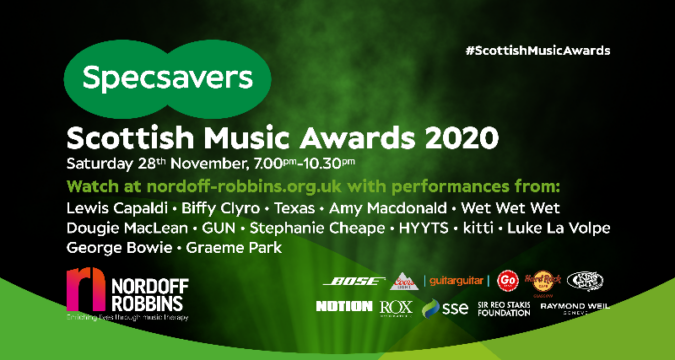 With only ONE week to go until 2020’s virtual Specsavers Scottish Music Awards brings some of the country’s biggest stars together to raise urgent funds for Nordoff Robbins music therapy charity, the countdown is on for the biggest night in Scotland’s music calendar. The event will go virtual for the first time ever, hosted live from Glasgow’s SWG3 by longtime supporter of the charity, Edith Bowman from 7pm on Saturday 28th November. Music fans can expect a night of celebrating some of Scotland’s biggest names with exclusive never-before-seen performances and footage, while raising vital funds for Nordoff Robbins music therapy, all from the comfort of their very own homes.