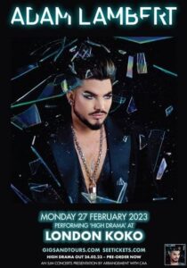 London, Friday 13th January– Today, Grammy-nominated international superstar Adam Lambert has announced an exclusive one-off album launch party show at London’s KOKO on 27th February 2023. Fans can pre-order any format of Adam’s upcoming album High Drama from his store before 12pm on the 17th January 2023 to be entered into an exclusive pre-sale. Pre-sale begins 18th January 2023 at 9am (please note that pre-sale access does not guarantee tickets.) Pre-order High drama here. General on-sale begins 20th January 2023 at 9am.