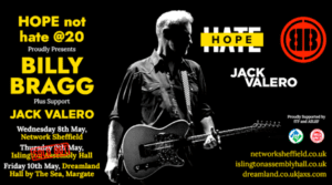 Says Nick Lowles from HOPE not hate: “Billy Bragg is an inspiration to us. We’re not just indebted to him for his twenty years of support, but for his forty years of music, words and poetry. His is the voice so many of us turn to when we look for someone or something to articulate how we feel about the many great injustices we confront.”
