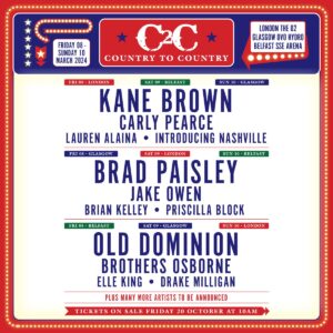 Following 2023’s 10-year extravaganza, Country To Country returns for the start of another decade celebrating country music. Since 2013, C2C has become Europe’s premier destination to see the world’s best country artists and future stars. 2024 will see another host of incredible artists perform at The O2, London, The OVO Hydro Glasgow and, for the first time ever, The SSE Arena, Belfast between Friday 8th and Sunday 10th March 2024.