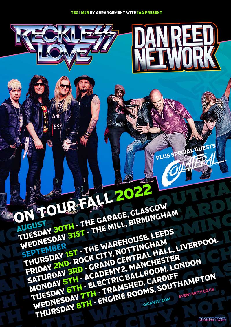 Dan Reed Network have rescheduled their February 2022 UK co-headline UK tour with Reckless Love and special guest Collateral to August and September 2022. Tickets for all shows remain valid. Tickets are available from www.gigantic.com/reckless-love-dan-reed-network-tickets and www.danreed-network.crom/tour.