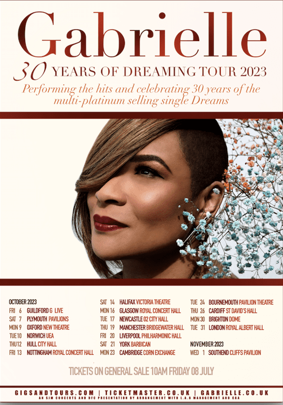 Tickets for the 30 Years of Dreaming Tour 2023 go on general sale from 10am next Friday, July 8th. They will be available from www.gigsandtours.com, www.ticketmaster.co.uk and www.gabrielle.co.uk. The dates are: