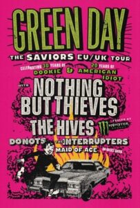 November 2, 2023 (Los Angeles, CA) – Global rock superstars Green Day – Billie Joe Armstrong, Mike Dirnt and Tré Cool – have officially shared details on their massive 2024 global stadium tour with support from with the illustrious rock luminaries The Smashing Pumpkins, Rancid, and The Linda Lindas in North America and Nothing But Thieves, The Hives, Donots, The Interrupters and Maid of Ace in the UK/EU. The Saviors Tour, fueled by Monster Energy, kicks off with the European run on 30 May in Monte De Gozo, Spain and travels through France, Germany and Italy, before reaching the UK, including a huge London show at the legendary Wembley Stadium on 29 June. The North American run, produced by Live Nation, begins shortly after on July 29 at Nationals Park in Washington, DC and makes 27 stops across North America in cities such as Toronto, ON; New York, NY; Chicago, IL; Atlanta, GA; Nashville, TN; Los Angeles, CA; Phoenix, AZ; San Francisco, CA and many more before wrapping up in San Diego, CA at Petco Park on September 28.