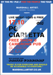 PG Ciarletta says, “It’s class to collaborate with Marshall Artist and This Feeling and be part of ‘By The People For The People: The Tour’. Making music accessible for all. At the end of the day without the people there is no music, that is the most important thing of all, so it’s great to give back and be part of these shows in a musically renowned city like Glasgow.”