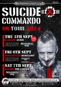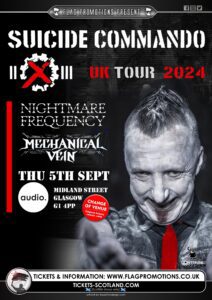 Hurry Up Harry! – It’s the last few days now to get your tickets for the awesome Industrial Ebm beast that is SUICIDE COMMANDO from Belgium – with what will be their first ever show in Glasgow Audio on Thursday 5th September 2024! – Also playing are local Edinburgh based industrial heroes NIGHTMARE FREQUENCY and the excellent MECHANICAL VEIN