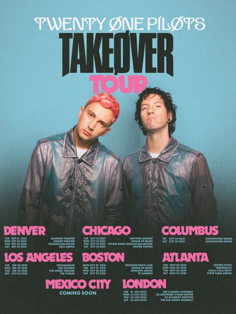 GRAMMY® Award winning duo Twenty One Pilots have announced details of their 2021 – 2022 global “Takeøver Tour.” The new dates will kick off on September 21st and see Twenty One Pilots performing multiple nights in Denver, Los Angeles, Chicago, Boston, Columbus, Atlanta, and London, scaling in each market from rare and intimate club performances to full-on arena spectacles [tour itinerary / admat below]. Registration for first access to tickets is open now via Ticketmaster’s Verified Fan platform and will run through 8:00PM ET / 5:00PM PT on Saturday, June 19th. For complete details and ticket availability for Twenty One Pilots’ “Takeøver Tour,” visit LiveNation.co.uk – tickets go on general sale Wednesday 23rd June at 9am.